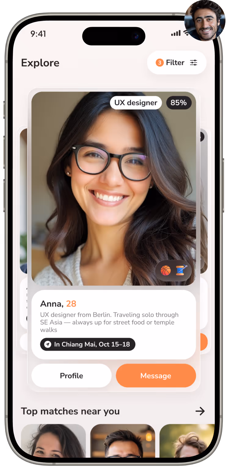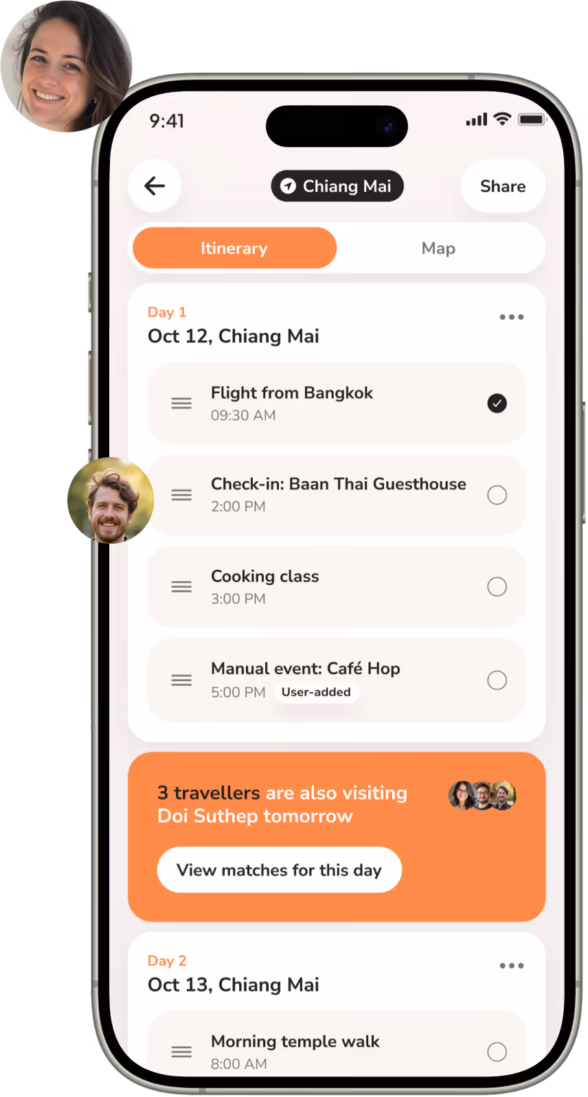Integrated planning and booking data helps match you with compatible solo travellers based on shared itineraries, interests, budgets, and travel timing.